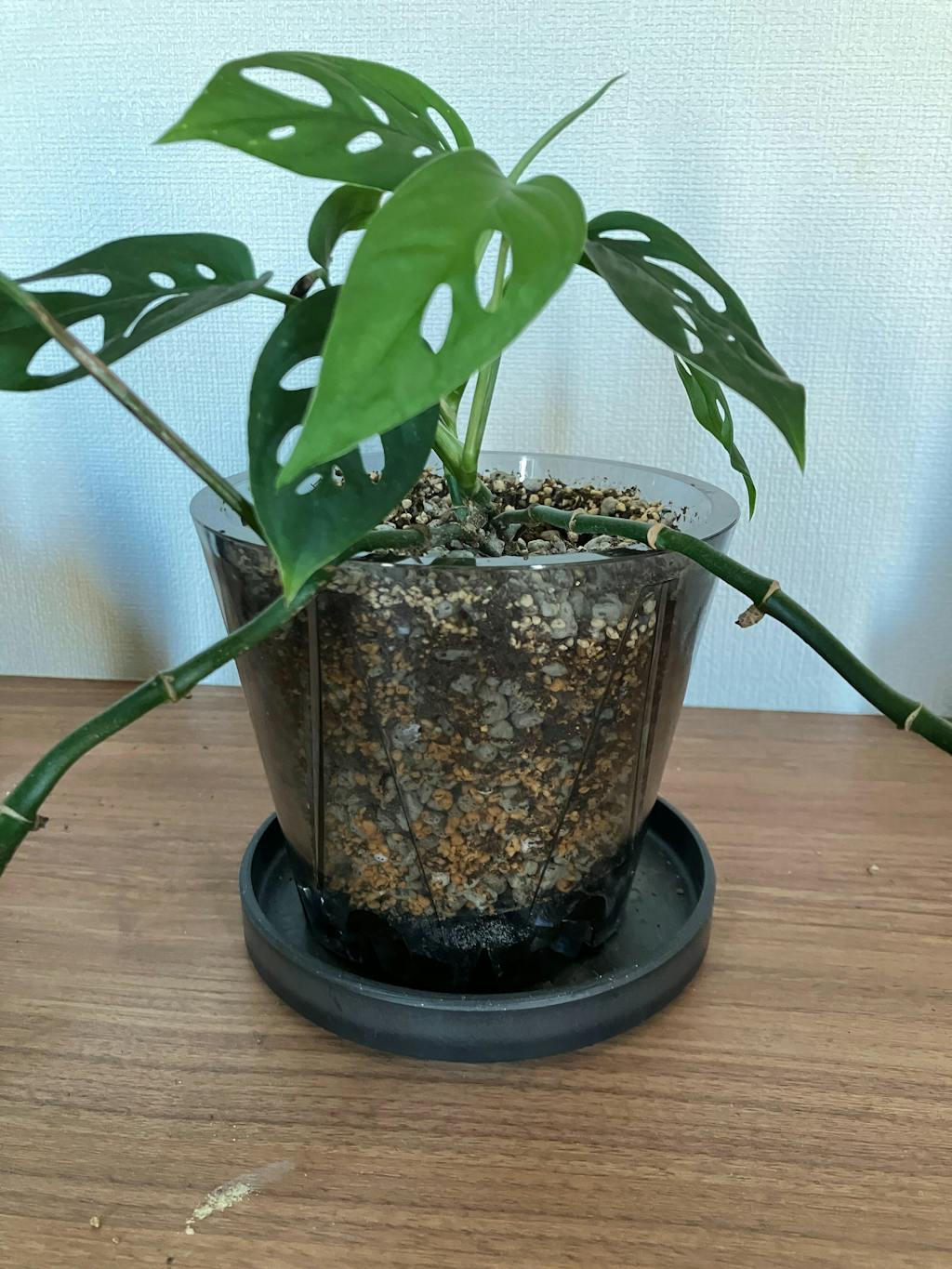 透明で中の様子が分かるのと、思ったよりも底の穴が大きく排水性が良いので使っています。