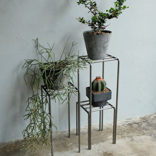 フレームとメッシュ状の天板の無骨な素材感が鉢の足元をクールに演出してくれるアイテムです。